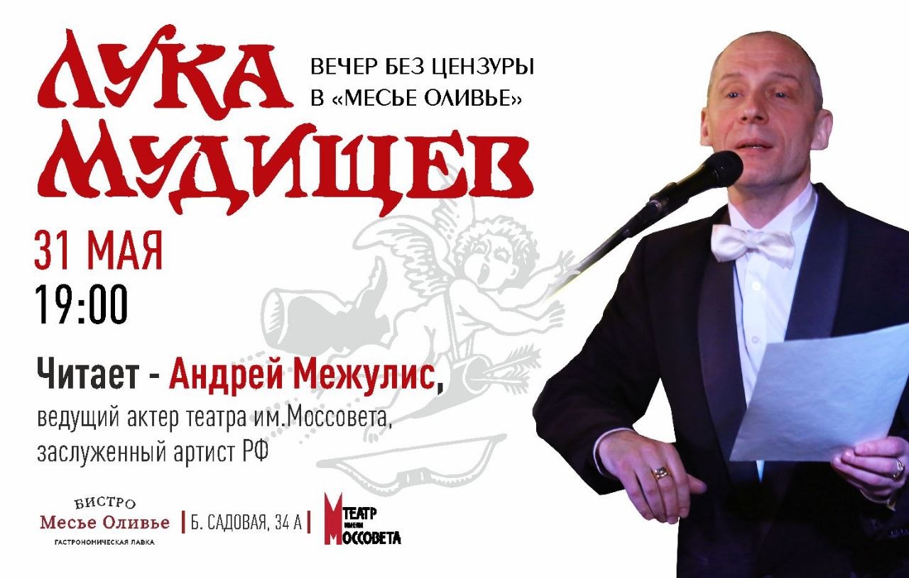 Вместе с гениальным рассказчиком, ведущим актером театра им.Моссовета, заслуженным артистом РФ Андреем Межулисом прикоснёмся к истокам русского матерного фольклора и услышим самое скандальное произведение русской литературы XIX века с простонародным юмором и эротическим содержанием "Лука Мудищев" в его уникальном исполнении.