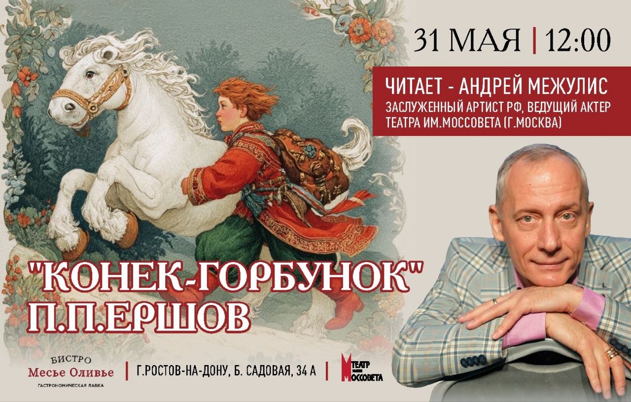 Всеми любимая сказка Петра Ершова "Конёк-горбунок" зазвучит совершенно по-новому - ярко, смешно, музыкально и живо из уст гениального актера театра и кино Андрея Межулиса (г.Москва), заслуженного артиста РФ, который неоднократно очаровывал юных слушателей своим искренним прочтением, а обсуждение сказки, сюрпризы и вкусный семейный обед станут прекрасным продолжением яркого чтения.